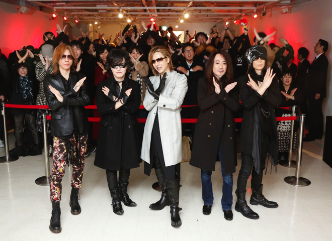2013年5月20日マダムタッソ―東京で、自分達のフィギュアの出来栄えを見ながら囲み会見を受けるXJapanのメンバー達。Toshlだけは、この時タイミングが合わずにフィギュアを作らなかった。